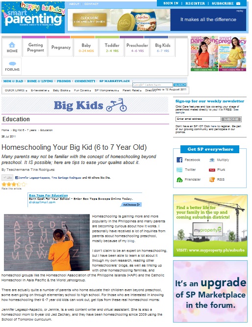 The above screenshot about Homeschooling Your Big Kid (6 to 7 Year Old) is a little blurry. You might want to go to the Smart Parenting website to read the whole article. It might not be on print all right. But we all know that online is where all publications are soon to go anyway. It’s more permanent. And really, I believe more and more people now favor reading online magazines over the physical one (I do!). But then again, it is still lovely to turn the crisp and colorful pages of a physical mag from time to time. 🙂