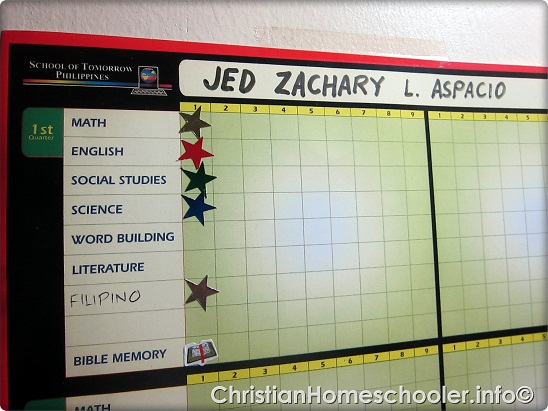 He works on his own, for the most part. The instructions are written clearly on the PACES and everything he needs is within his reach (Math kit, supplies, et.al). He calls me by using the flags (Philippine Flag and Christian Flag) on his school office to do that. Which I will write about soon. He calls me to check his test. But he also gets to score his own PACES.