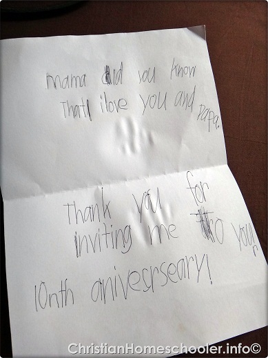Not perfect. With an erasure and the word “anniversary” wrongly spelled. But he did it all by himself with no help from any of us. I wasn’t even too sure that he was getting on it still. I love that he thanked us that we invited him to our anniversary. Because really, we could have easily chosen to just leave him behind and celebrate without him. Somehow in his little mind, he knew this was possible so he thanked us for inviting him to our 10th anniversary celebration. And here’s the kicker – he placed the card inside my bag. When he thought there was no way I was going to rummage through my bag anytime soon, he hinted for me to check out my bag and get the card he made for us. How can we have the heart to leave such a sweet boy behind?
